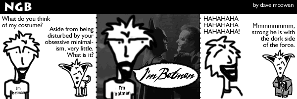 June 27, 2010 - Hi everyone! Yes I know I've been gone for a long time, and unfortunately (or fortunately) I'm not going to ply you with promises of the continuing shenanigans of Nice Guy and Dingo. It may happen; it may not. Too soon to tell. But I did want to send out a great big thanks for putting Nice Guy But over the 1,000,000 page view mark! I never expected my little creative self-medication project would reach so many people. Thanks!