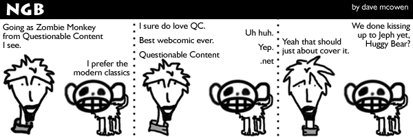 June 27, 2010 - Hi everyone! Yes I know I've been gone for a long time, and unfortunately (or fortunately) I'm not going to ply you with promises of the continuing shenanigans of Nice Guy and Dingo. It may happen; it may not. Too soon to tell. But I did want to send out a great big thanks for putting Nice Guy But over the 1,000,000 page view mark! I never expected my little creative self-medication project would reach so many people. Thanks!
