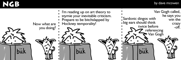 June 27, 2010 - Hi everyone! Yes I know I've been gone for a long time, and unfortunately (or fortunately) I'm not going to ply you with promises of the continuing shenanigans of Nice Guy and Dingo. It may happen; it may not. Too soon to tell. But I did want to send out a great big thanks for putting Nice Guy But over the 1,000,000 page view mark! I never expected my little creative self-medication project would reach so many people. Thanks!