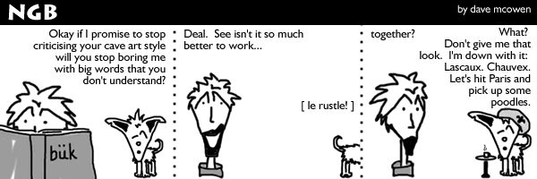 June 27, 2010 - Hi everyone! Yes I know I've been gone for a long time, and unfortunately (or fortunately) I'm not going to ply you with promises of the continuing shenanigans of Nice Guy and Dingo. It may happen; it may not. Too soon to tell. But I did want to send out a great big thanks for putting Nice Guy But over the 1,000,000 page view mark! I never expected my little creative self-medication project would reach so many people. Thanks!