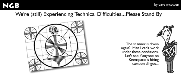 June 27, 2010 - Hi everyone! Yes I know I've been gone for a long time, and unfortunately (or fortunately) I'm not going to ply you with promises of the continuing shenanigans of Nice Guy and Dingo. It may happen; it may not. Too soon to tell. But I did want to send out a great big thanks for putting Nice Guy But over the 1,000,000 page view mark! I never expected my little creative self-medication project would reach so many people. Thanks!