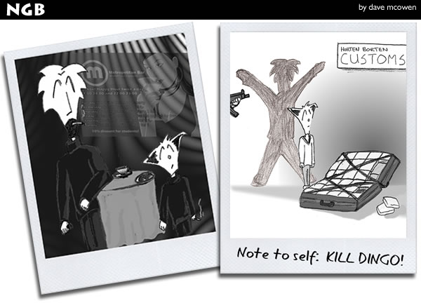 June 27, 2010 - Hi everyone! Yes I know I've been gone for a long time, and unfortunately (or fortunately) I'm not going to ply you with promises of the continuing shenanigans of Nice Guy and Dingo. It may happen; it may not. Too soon to tell. But I did want to send out a great big thanks for putting Nice Guy But over the 1,000,000 page view mark! I never expected my little creative self-medication project would reach so many people. Thanks!